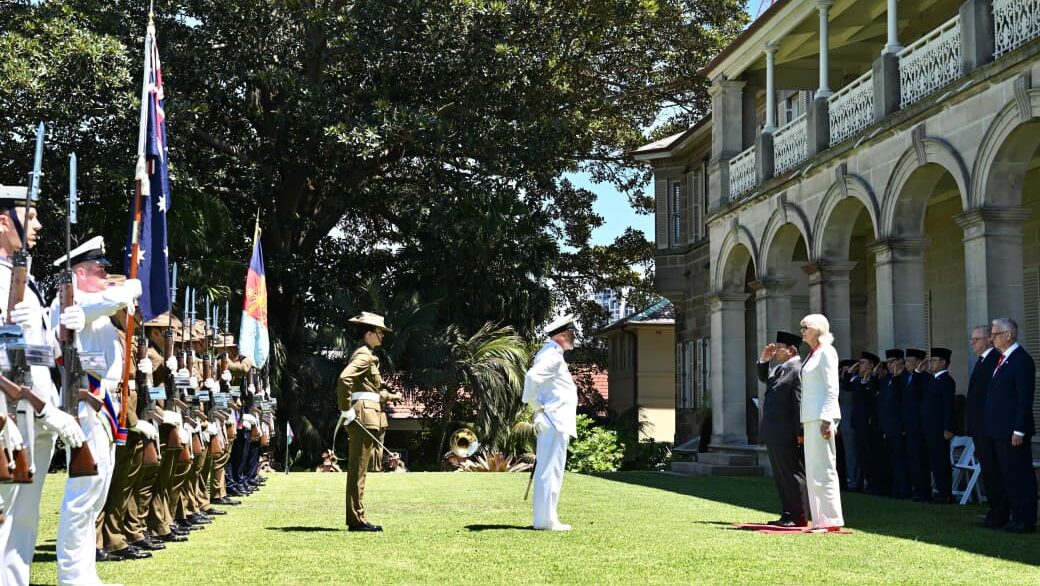 Presiden Republik Indonesia Prabowo Subianto disambut oleh Gubernur Jenderal Australia Sam Mostyn dalam upacara kenegaraan yang digelar di Admiralty House, Sydney, pada Rabu, 12 November 2025.